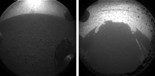 These are the first images taken by NASA’s rover Curiosity after landing in Gale Crater on Mars, shot with the rover’s Hazcam cameras. The image on the left shows one of the rover’s wheels. When it first showed up on the screen in JPL’s mission control, someone could be heard shouting “It’s the wheel, it’s the wheel!” The image on the right shows rocks, dust, and the rover’s shadow on the surface of Mars.