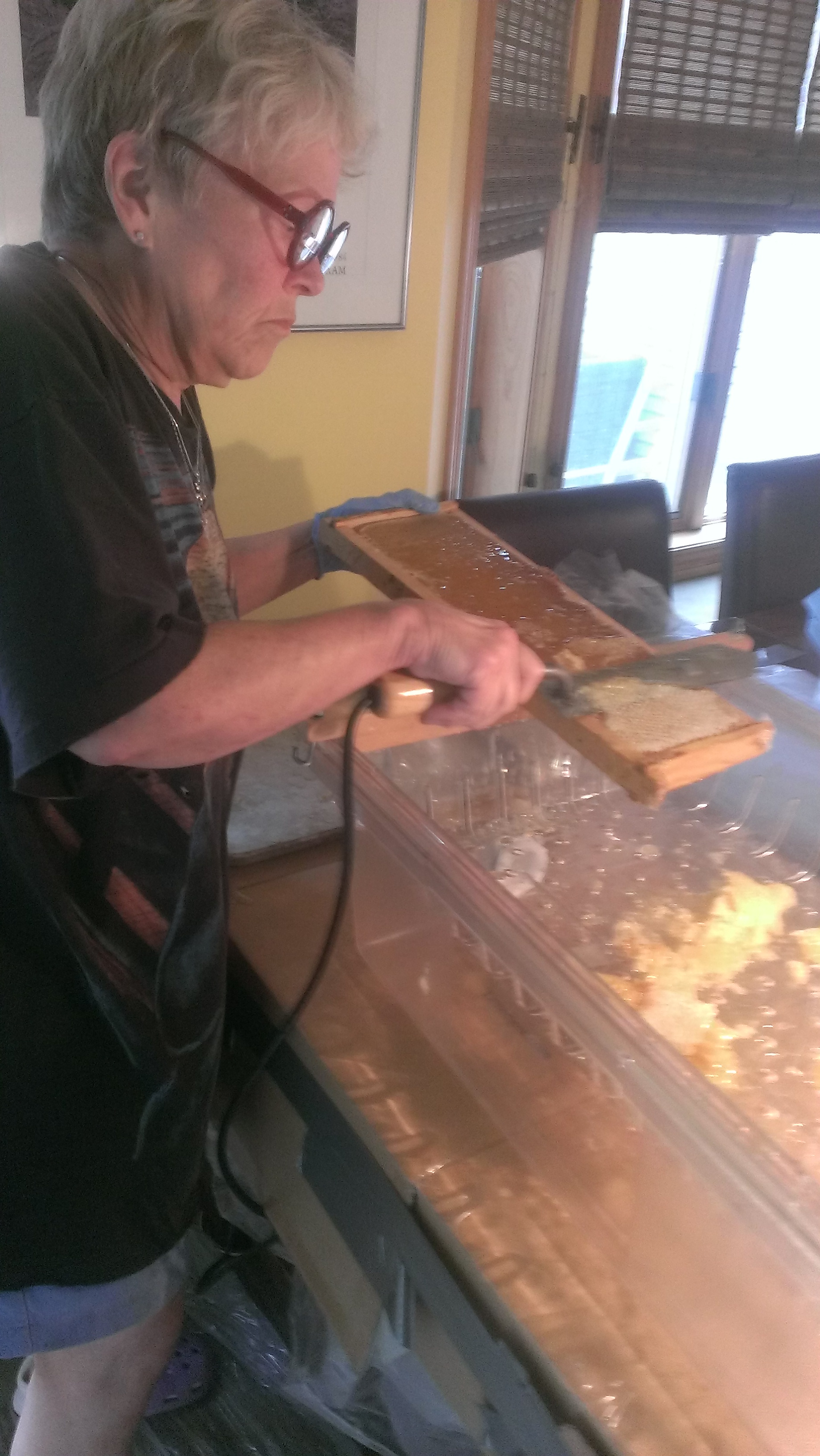 Kate uncapping the honey. We’ve developed a rhythm, a working partnership when it comes to caring for the land and our plants. We share the space and the work with bees, the living organisms of the first six inches of the soil and the dogs who keep critters out of our garden and orchards.