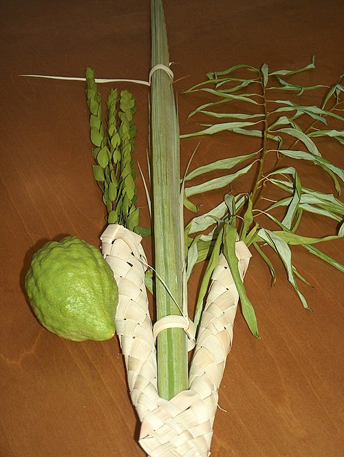 The lulav:** The lulav (with three species) is held in the right hand and the ertrog in the left. A blessing for the harvest and for rain is implied as the lulav gets waved through all four directions plus up and down.