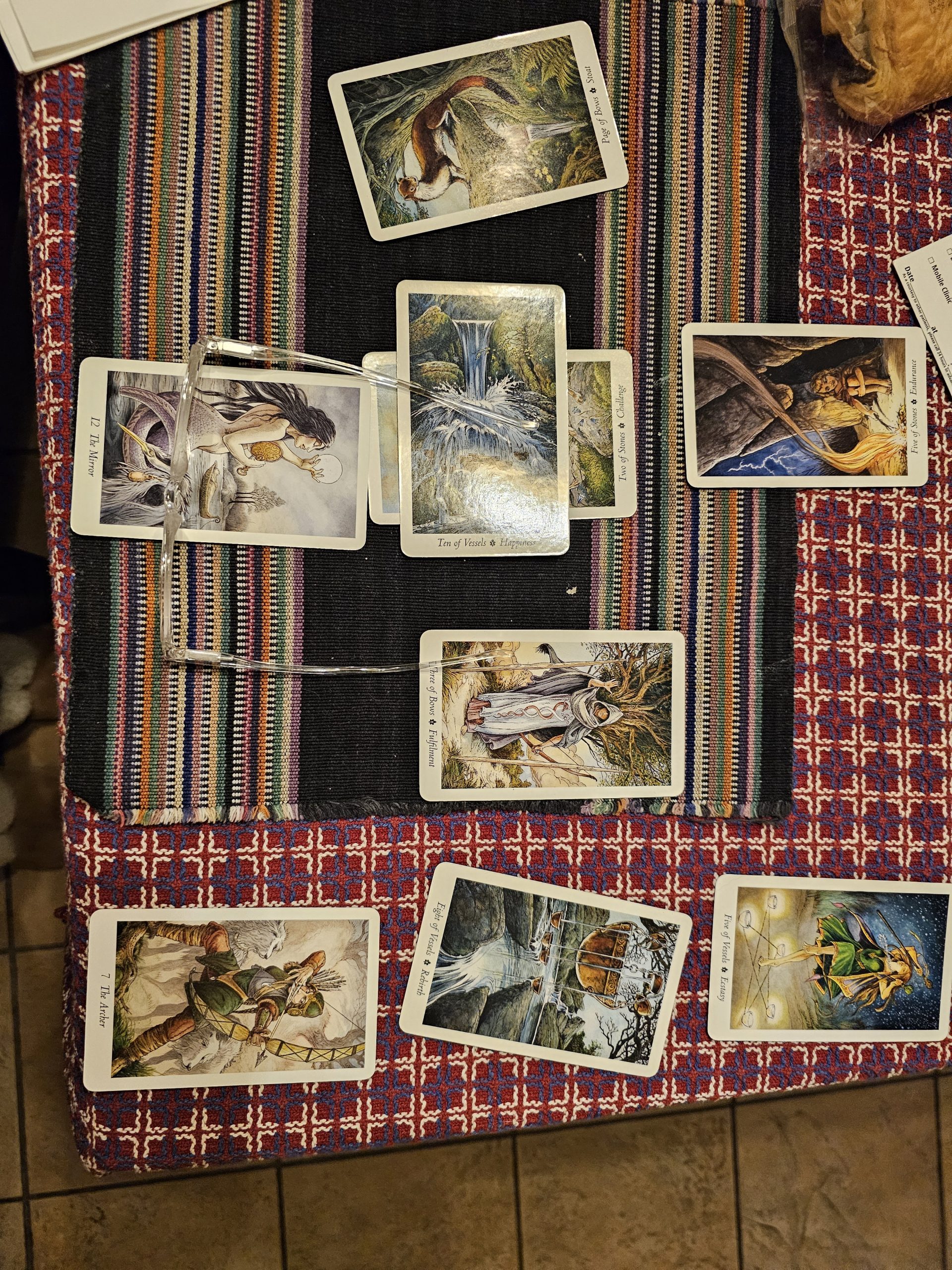 One brief shining: Laid out the cards selected by intuition from my Wildwood Tarot deck, placing the first card horizontal, for the present, and the second card over, vertical for the challenge, then in the way of this spread, cards from three to ten, four surrounding the first two, and four more running up the far right side beside those six, and turned them over one by one to get an answer to my question, how do I live my best life in 2026?