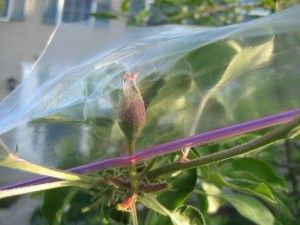 Out bagging apples. This is, according to what I’ve read, the only organic way to grow apples. It’s fussy and difficult to some extent since a lot of the work is over the head and requires fine motor skills to seal the ziplocks. Still, better than spraying and it’s one and done, unlike spraying.