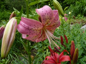I’ve got lilies blooming. They’re early. By about a week, maybe a bit more. Lilies are my favorite flower, Asian lilies and Martagons. Their colors are deep, rich, luminous. I don’t know what it means that they’re out so early. Might be the peculiar combinations of heat, cool and lottsa rain.
