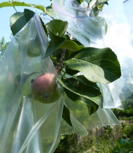 The third tree (whose name I can’t recall either right now) has ten. Not sure what happened to it. It only blossomed on the most westerly branches and then sparsely. Like the other two it had leaf rollers active early, but the leaves otherwise look healthy and the leaf rollers don’t explain, at least I don’t think they do, the minimal blooms and even smaller fruit set. Anyhow the apples have all got bags and within, roughly, the best time. Best time, when they’re larger than a pea, got rained on and on and on, but at the first dry moment, we’re done.