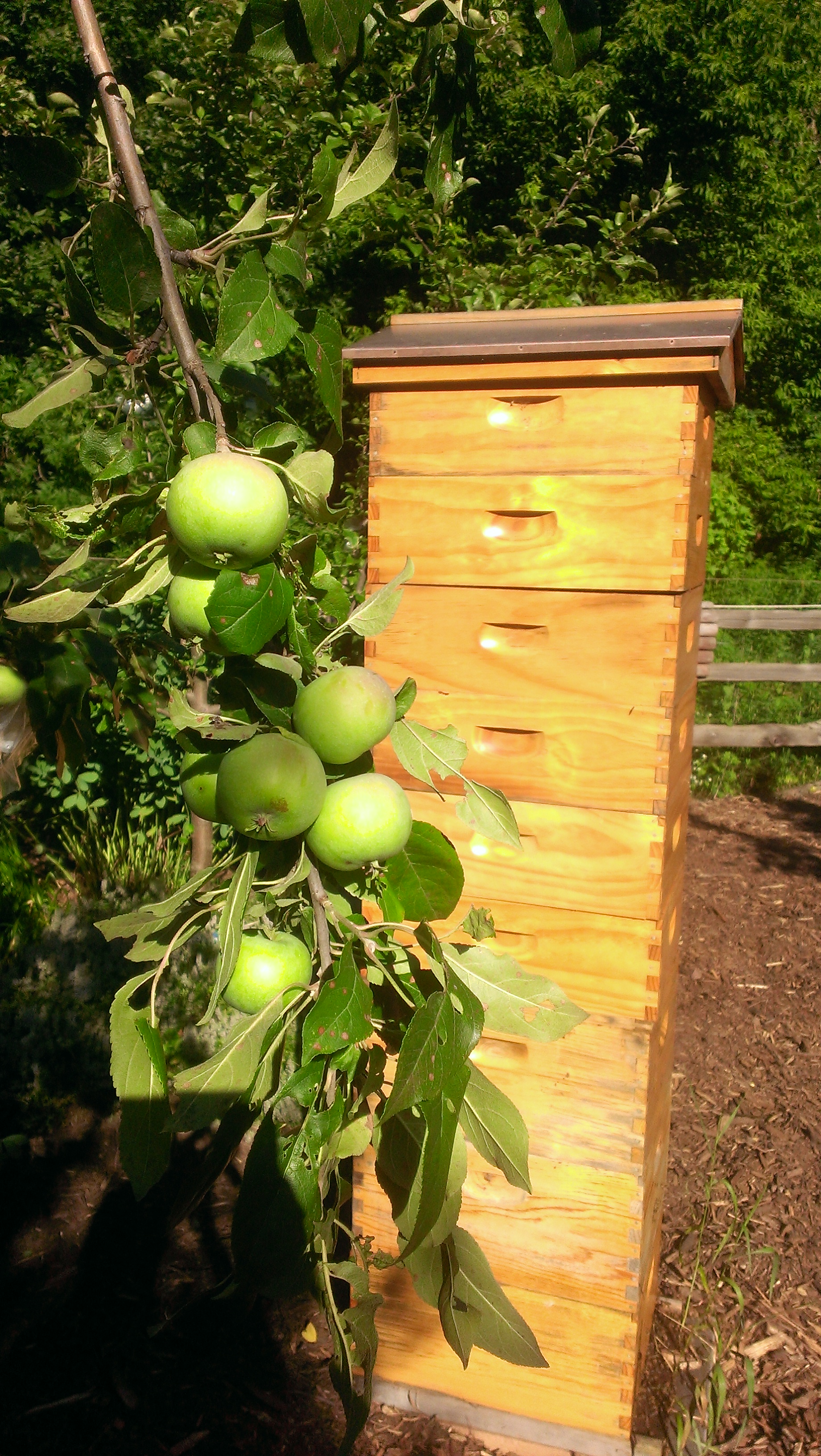 The bees continuing working at their in and out pace, workers flying off in all directions seeking the nectar while the the nectar flow still runs. Our six supers make the colony look like an entomologically designed high-rise apartment complex. Thousands of inhabitants, food and nursery service included.