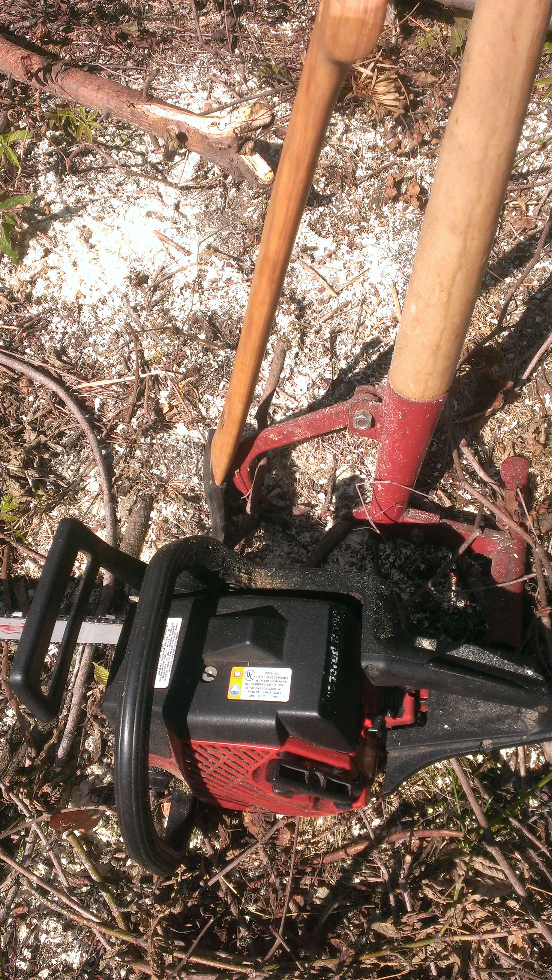 This project involved cutting down several ash trees and saplings that I had let grow up in the prairie grass area. They had begun to shade the orchard and it was time for them to come down. Past time, really. I cut the trees down with the felling axe and limbed them with the limbing axe, but I used the chain saw to cut the trunks into logs. The big pruners, 2 foot plus handles, allowed me to take out the amur maple saplings, too. That area is now back to its original purpose, prairie grass and wild flowers.