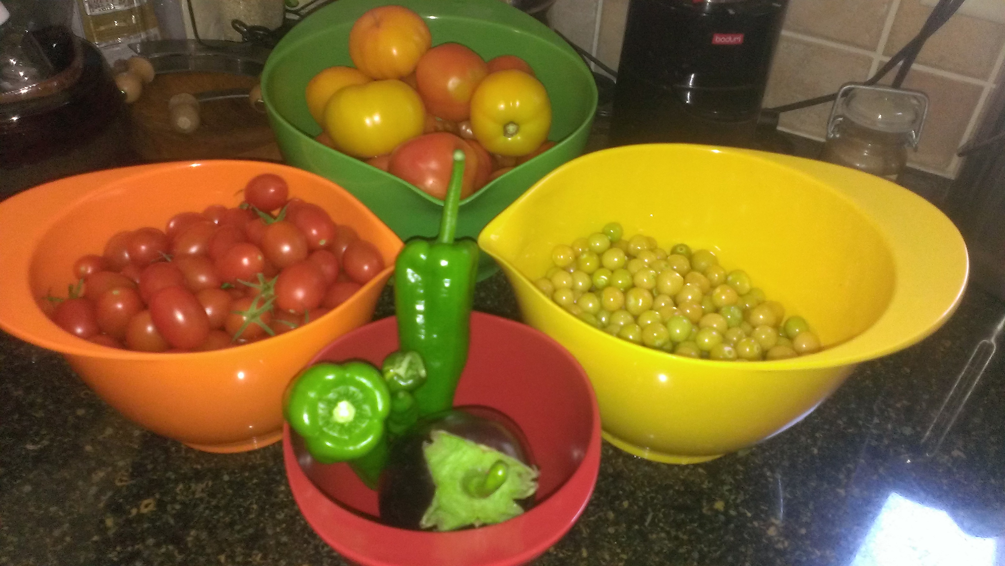 Kate and I were out before 8 am today harvesting raspberries, tomatoes, cucumbers and ground cherries. The tomatoes and cucumbers are in their last week +. The ground cherries seem set to keep on producing through the first heavy frost and the raspberries have only begun to ripen. We still have peppers and leeks, a few greens left.