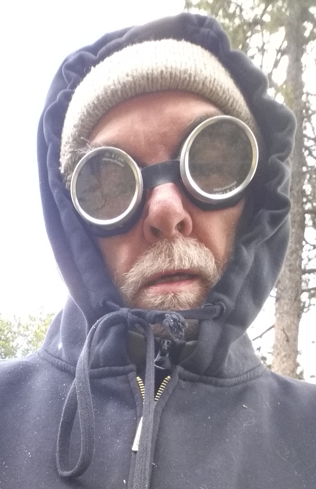 German safety goggles, knit hat and Honolua hoodie. The perfect fashion statement for Shadow Mountain lumberjacks.