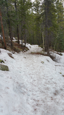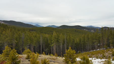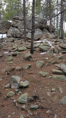 This trail runs first through a forest of lodgepole pine, then opens to a burned out area with a magnificent vista to the north. I’ll post the pictures later today. After the burned out area, which is fairly level, the elevation gain became serious, for me at least. The forest thins out, with older trees. When the trail continues up past a service road, it begins to get rocky.