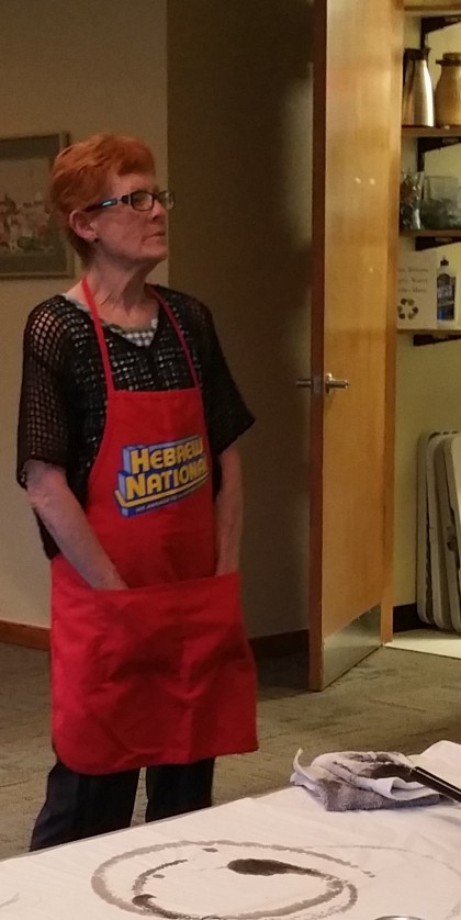Under the sumi-e moon I introduced this ancient art form to the qabbalah class. It was a sight. I forgot to take the aprons from home and asked Tara if Beth Evergreen had aprons. She found some. All but one were bright red aprons with Hebrew Nationals (a hot dog) in prominent blue letters.