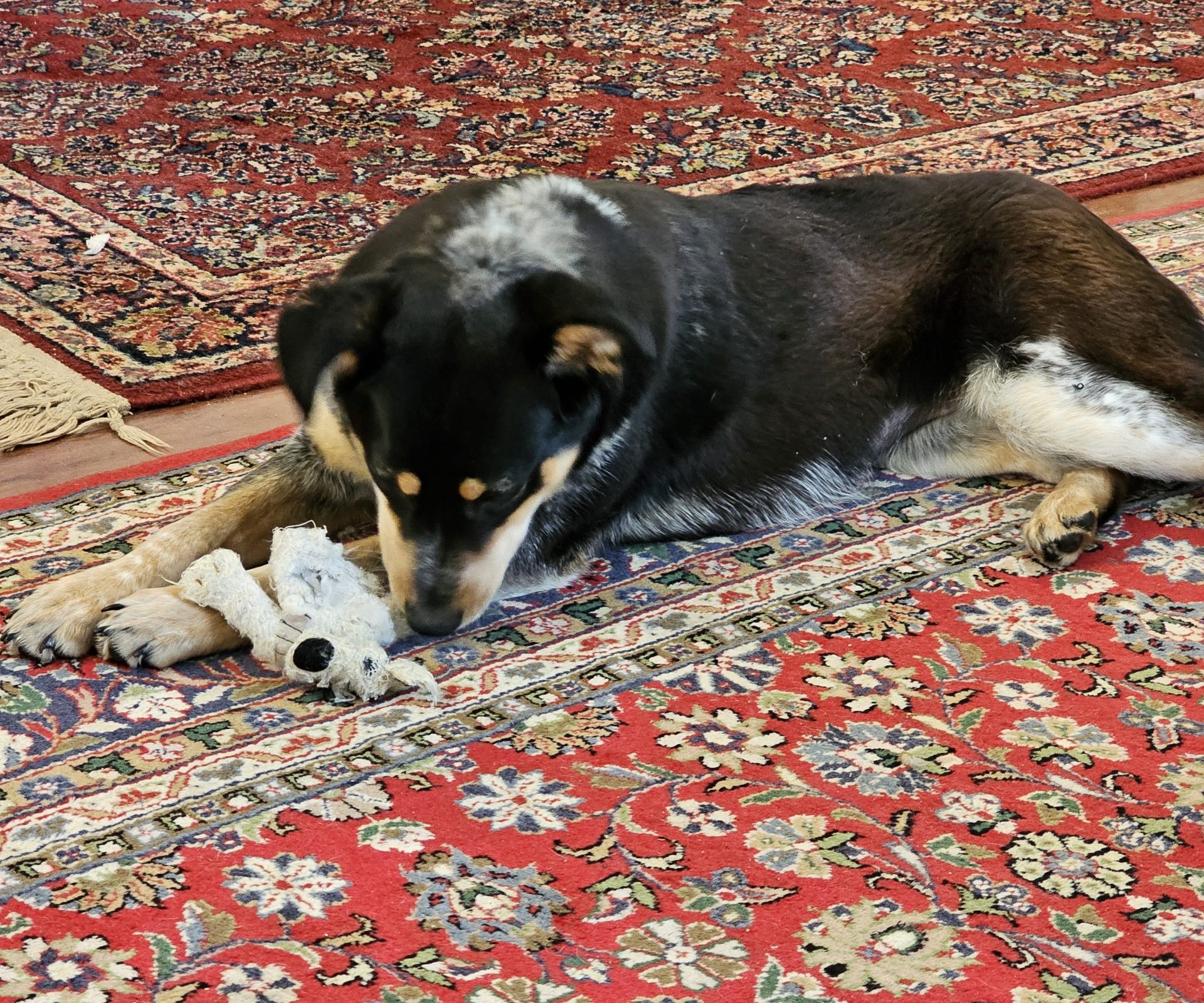 Friday gratefuls: Shadow’s morning greeting. All bounce and joy. Alan at the Baglery. Evergreen. Conifer. Bailey. Constipation. My Taos ring. Kate, always Kate. Shadow’s bed. No more stuffing. Elon and China. Treats. Shadow and her toys. Bagels. Losing weight.